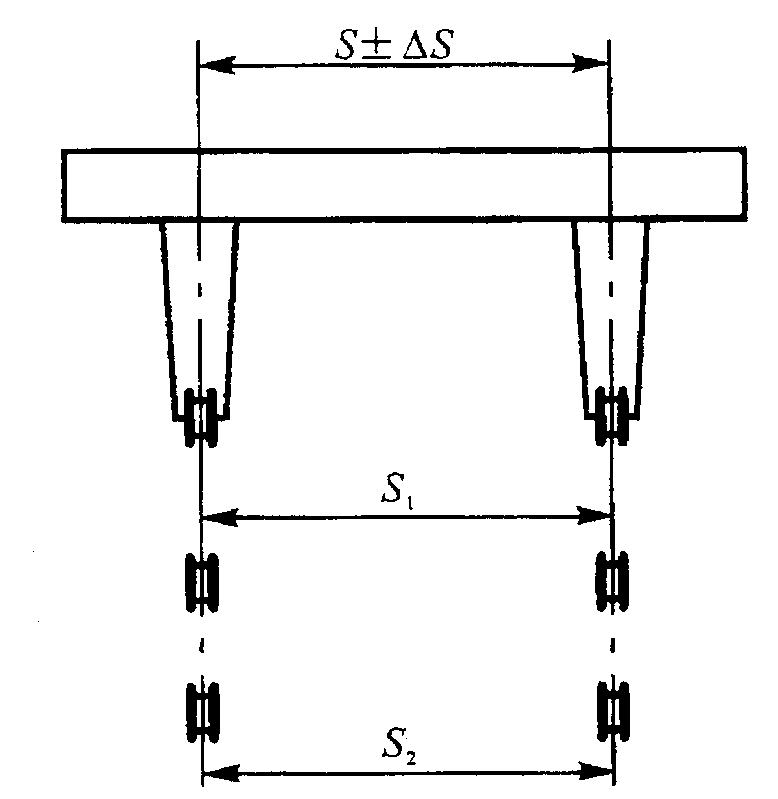 1、由車輪量出的起重機跨度S1,S2 跨度相對差│S1,S2│ 2、由橋架量出的起重機跨度S3,S4 跨度相對差│S3,S4│ |