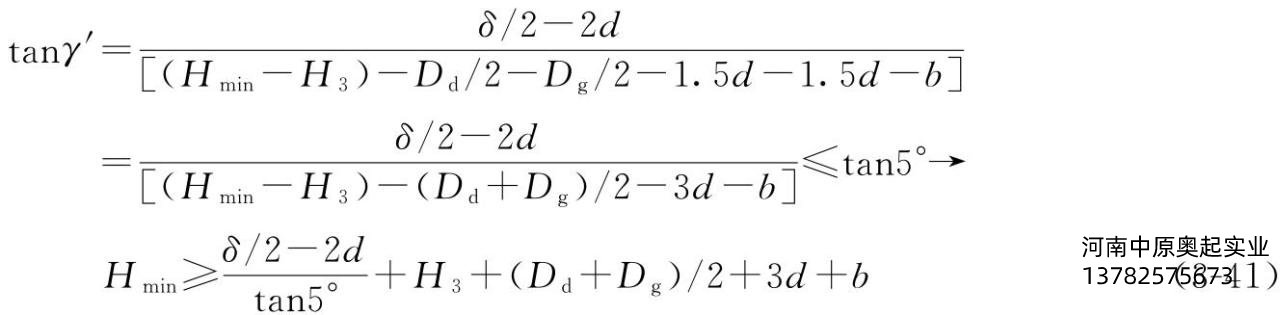 設(shè)卷筒鋼絲繩出繩點*靠近卷筒*外面定滑輪中心線的距離為δ,吊鉤組近似在卷筒和靠近*外面的定滑輪中心線的δ/2處,吊鉤的起升極限距離Hmin可以從下式求出。