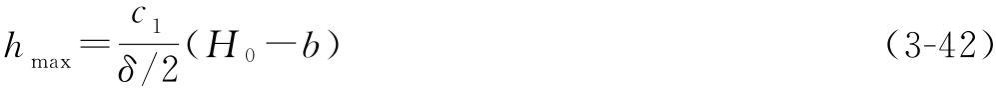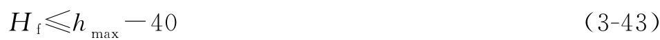 Hmin必須同時滿足式(3-40)和式(3-41),此外,還必須考慮hmax值對鋼絲繩的影響。當(dāng)小車橫梁過高,橫梁靠近卷筒側(cè)的腹板可能與鋼絲繩干涉(圖3-52)。從橫梁滑輪軸到橫梁*低端的距離Hf,推薦按式(3-43)校核,當(dāng)Hf值大于hmax-40時,需將小車橫梁里的滑輪組向右移布置,直到Hf滿足小于或等于hmax-40值。