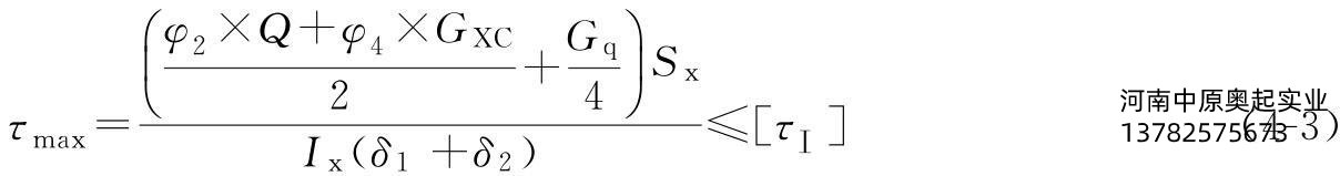 大車主梁和端梁由主梁兩端的承壓梁和端梁連接,在其厚度為δ4的承壓梁下蓋板處用定位銷和高強度螺栓與大車端梁定位連接(圖4-26),其主梁在跨端承受由小車自重和*大額定起重量對其起剪壓作用R,和大車總重對承壓梁的剪壓作用Gd。