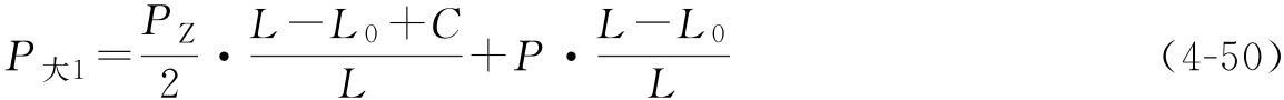 P通過大車端梁作用在全包廂式龍門吊大車每一個角的兩個車輪上,轉化到大車軌道平面上的受力分析見圖4-48。四個角上的每組車輪中的P大1、P大2較大值就是起重機的大車*大輪壓。