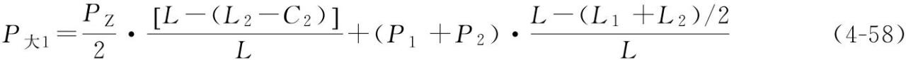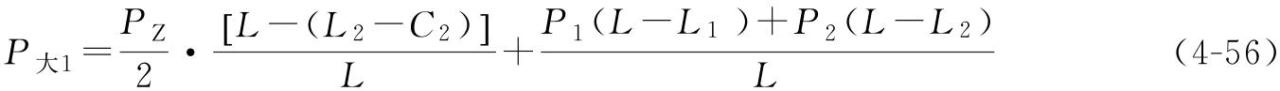 式中 P大1——靠近大車主梁走臺外側(cè)的車輪群總輪壓,每一個(gè)車輪輪壓為P大1/m;每一個(gè)角的車輪群數(shù)量為m;